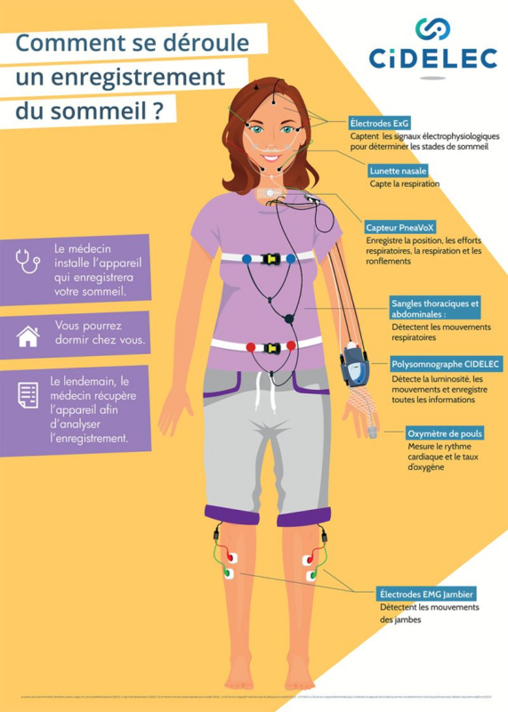 Elle mesure les différents stades de sommeil, la respiration, les mouvements oculaires, les mouvements des jambes et l’activité cardiaque.